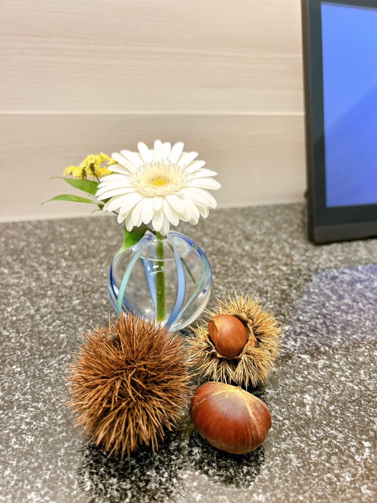 暑さも和らぎ、秋らしく過ごしやすい時期になってきましたね。納骨堂てらすでは、デジタル祭壇に季節を感じられるお花や植物なども一緒に飾っています。飛鳥寺には大きな栗の木があり、秋になるとたくさんの栗がなります。今年もたくさんの実を付けました。