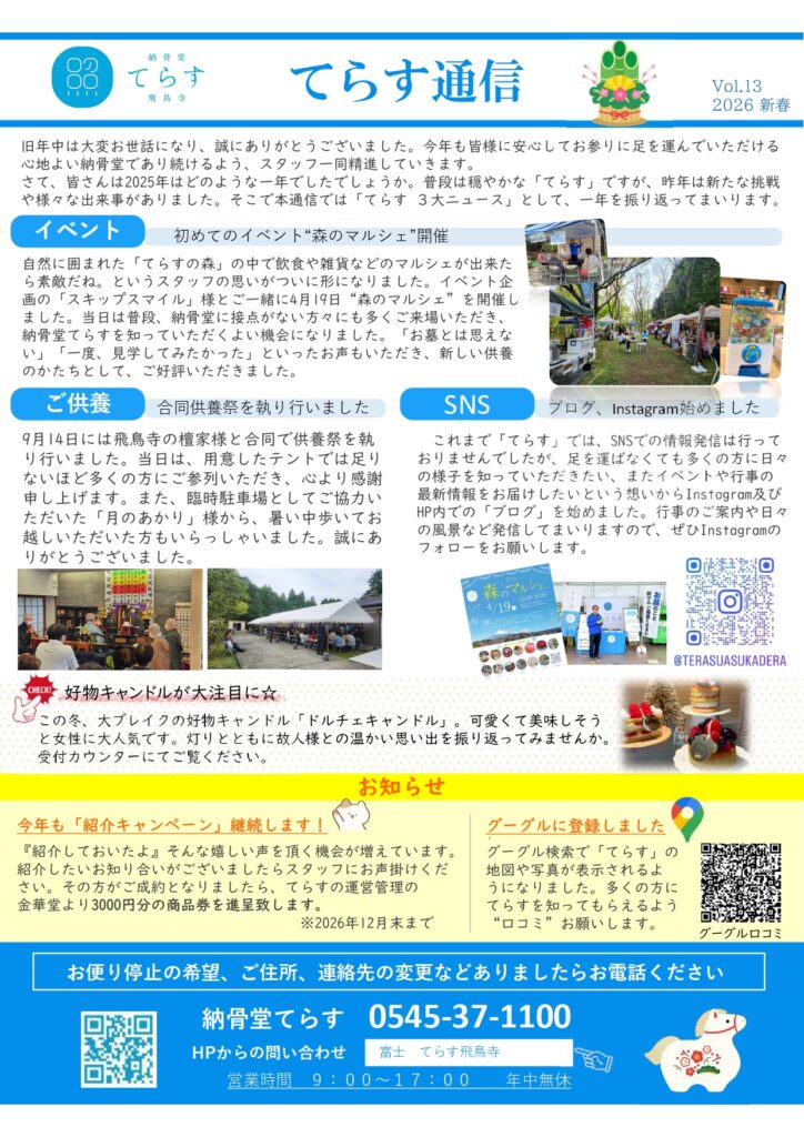 暦の上では「大寒」と呼ばれ、1年で最も寒い時期に入ってきましたが、みなさまお変わりなくお過ごしでしょうか。今日はてらすから送らせて頂いているお便りを紹介しようと思います。年に数回、お客様へ向けて「てらす通信」を送っています。内容は季節によっても変わりますが、イベントの告知やその様子、日々の出来事やてらすの近況報告なども綴っています。